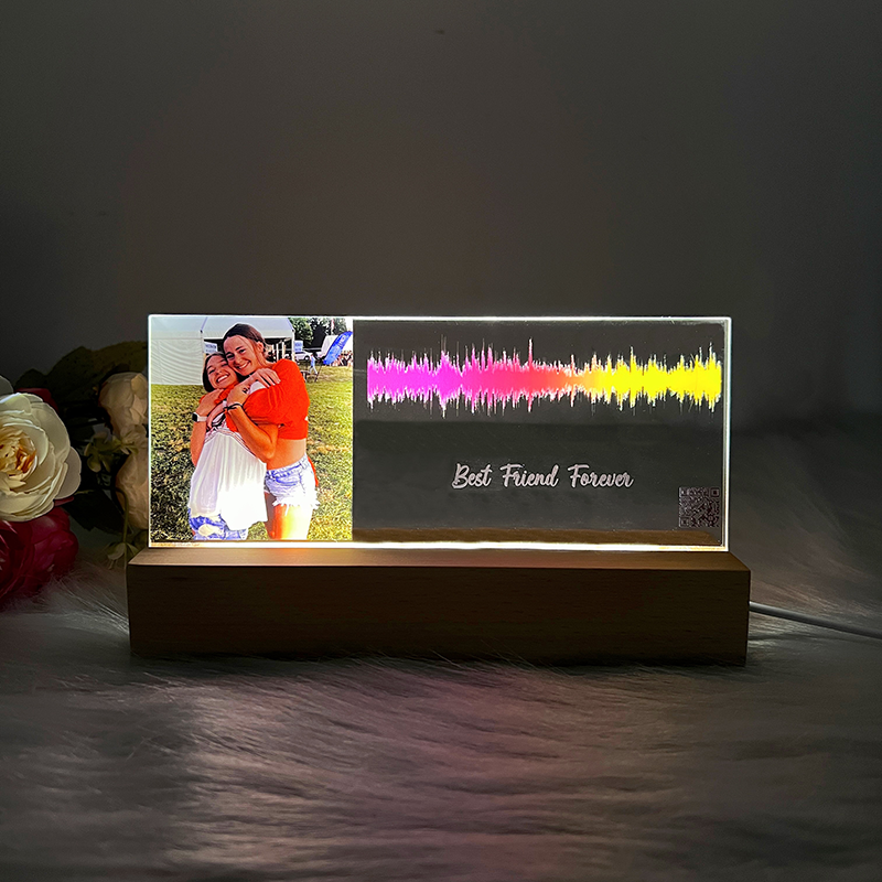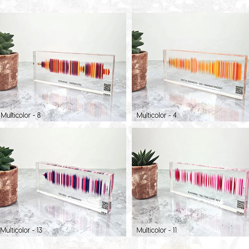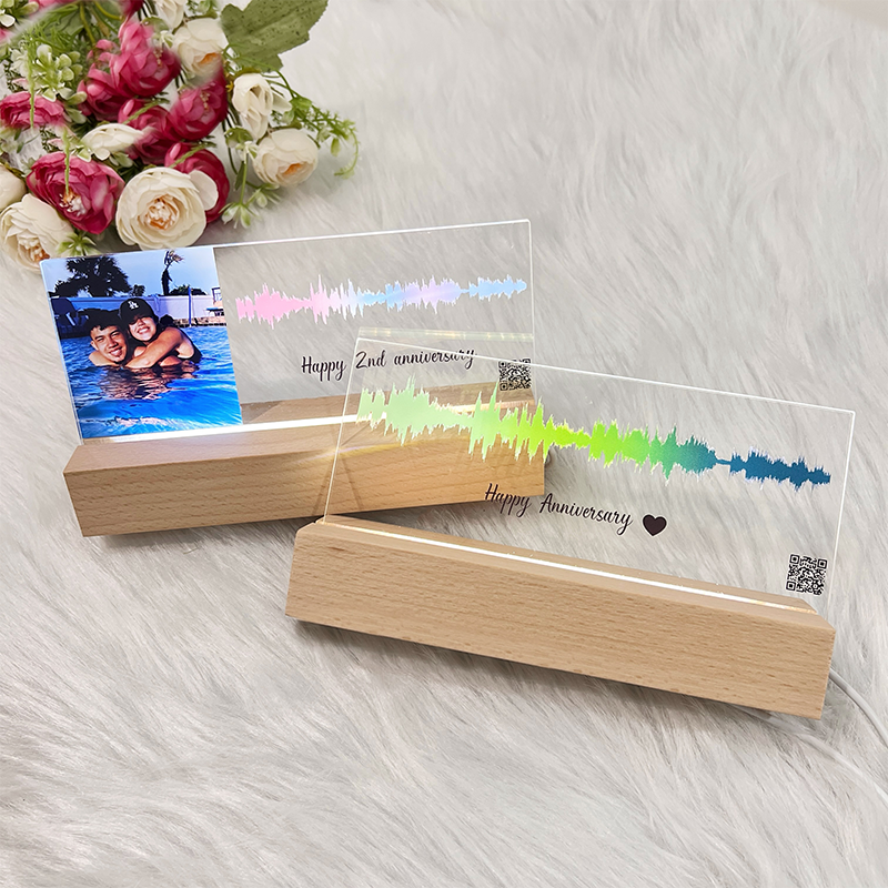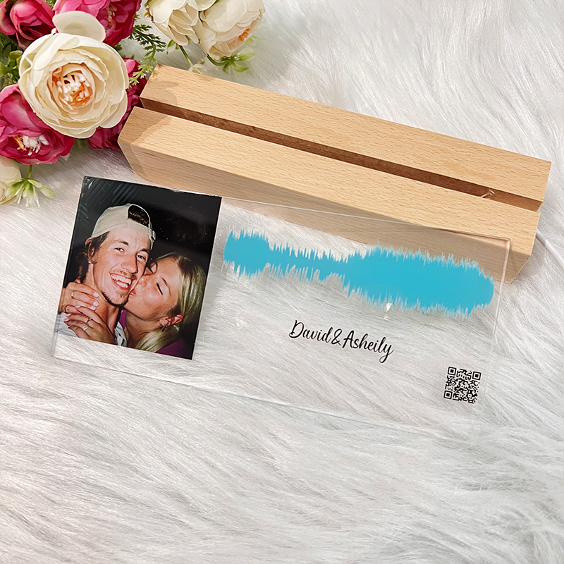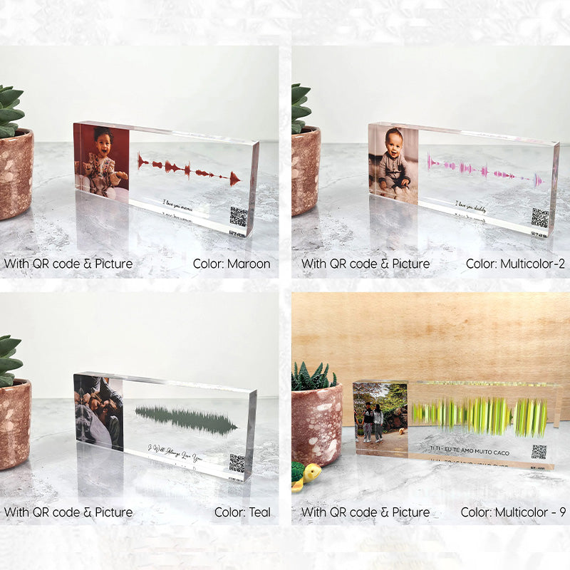 Look no further than our personalized Soundwave art! Our Soundwave art is a clear acrylic block that features a unique sound wave design that can be customized with a photo, song, or voice recording and text of your choosing. Perfect for any special occasion, from anniversaries to birthdays and even retirements.
