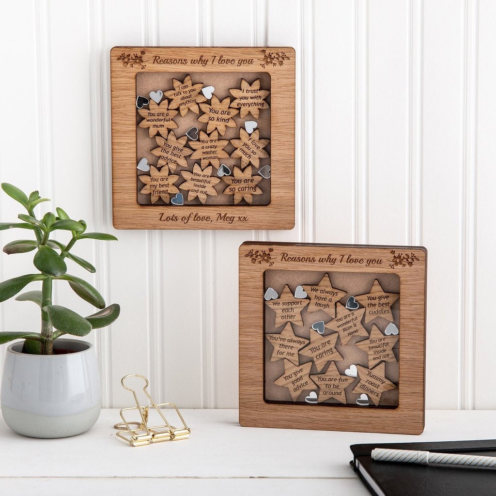 Diese Mini-Version ist wirklich anpassungsfähig und kann für jeden, den Sie wünschen, hergestellt werden, mit den personalisierten Gründen, die entweder auf Herzen, Sternen oder Blumen eingraviert sind, sowie mit Ihrem eigenen Wortlaut am oberen und unteren Rand des Rahmens.