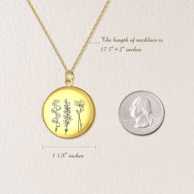 Personalized Locket Necklace - Custom Birth Flowers Bouquet Locket - Photo Necklace with Engraving is a beautiful and elegant piece of jewelry. Handcrafted with attention to detail, this pendant allows you to carry your most precious photos, memories and other treasures with you. The pendant can be personalized with the birthday flower of your choice on the front and a custom inscription on the back, adding a unique touch to this special gift. Simple flowers create a one-of-a-kind necklace. It will be a one-of-a-kind gift that will add meaning to your precious day (e.g. graduation, birthday, mother's day, wedding).✿ Product - Dimensions