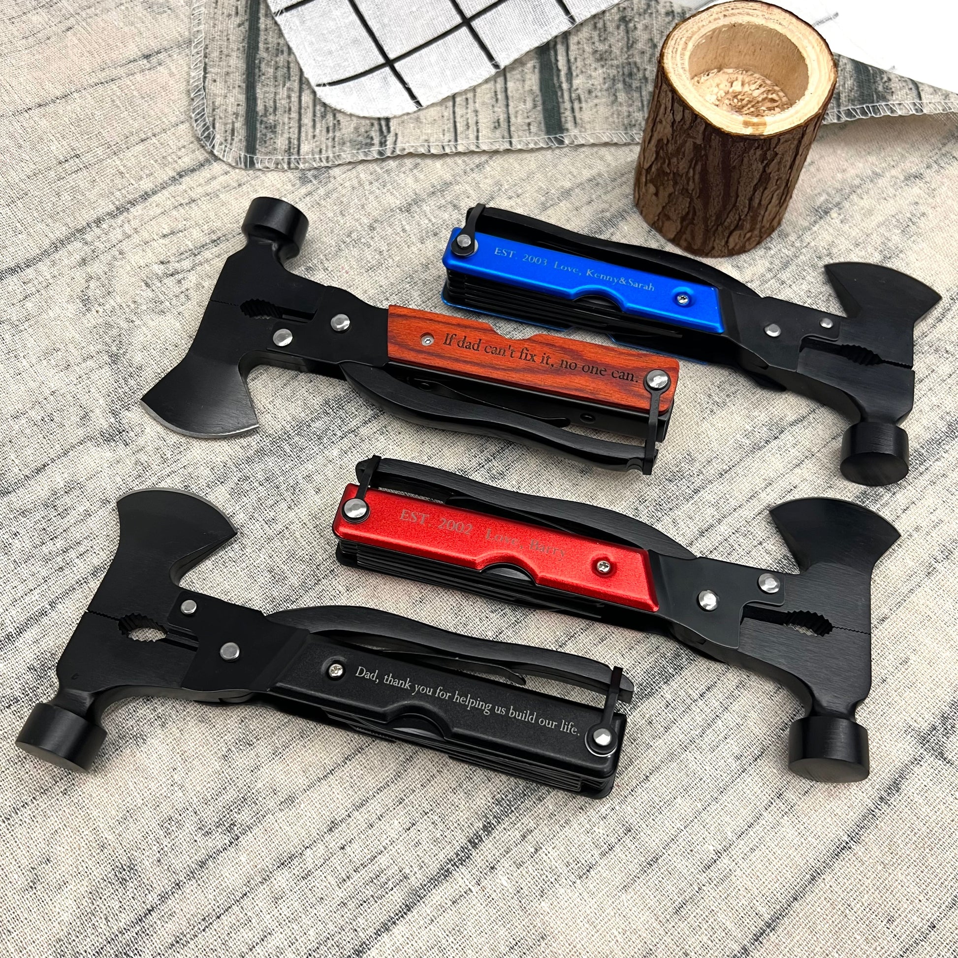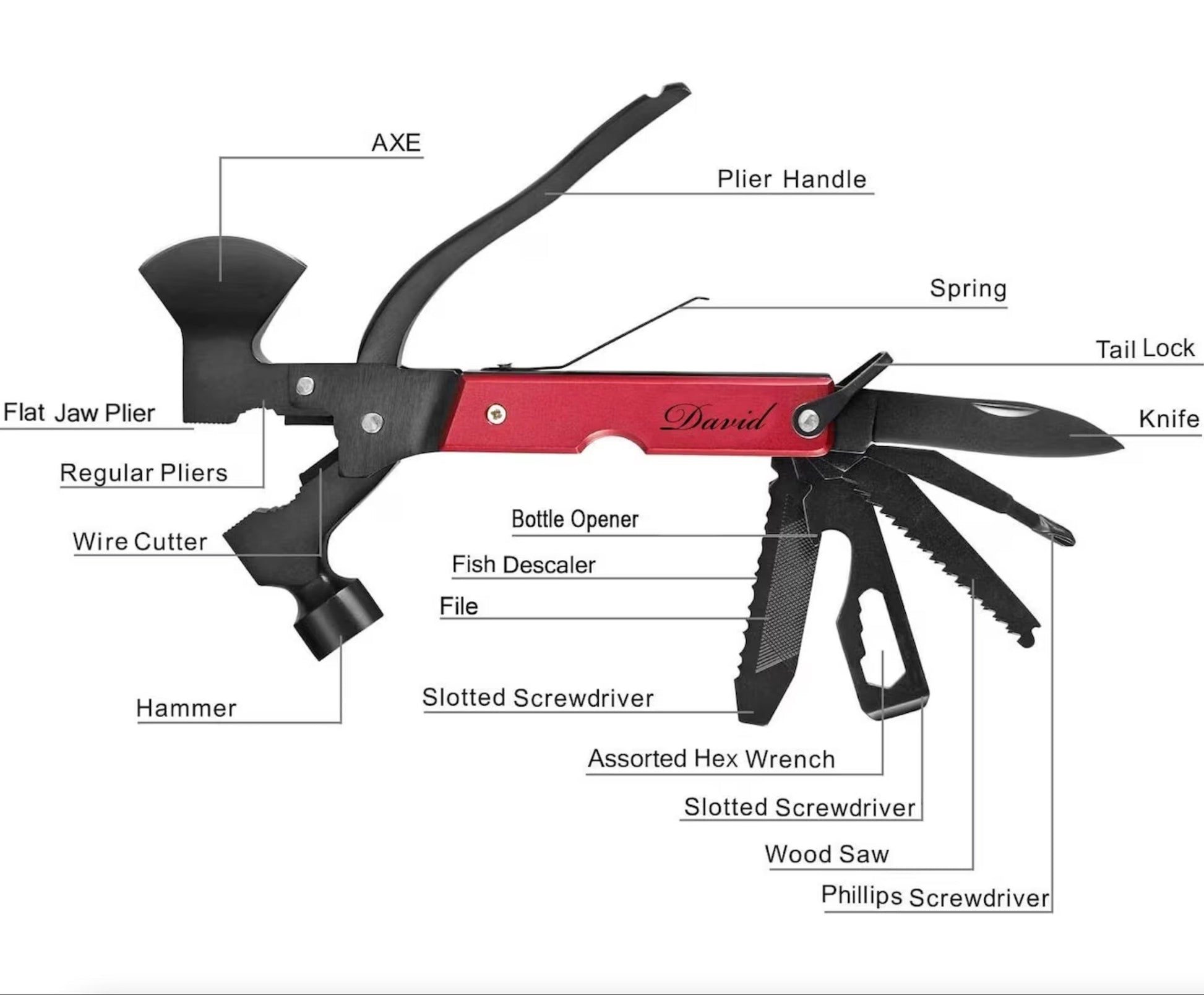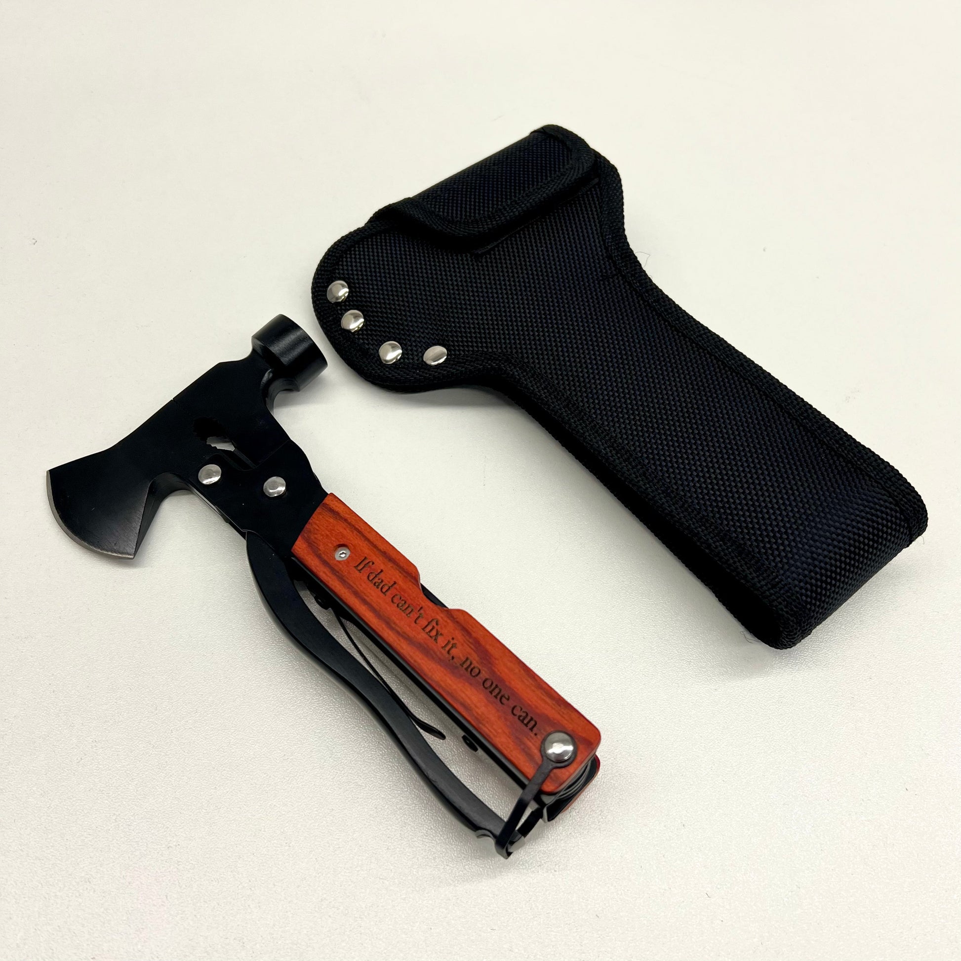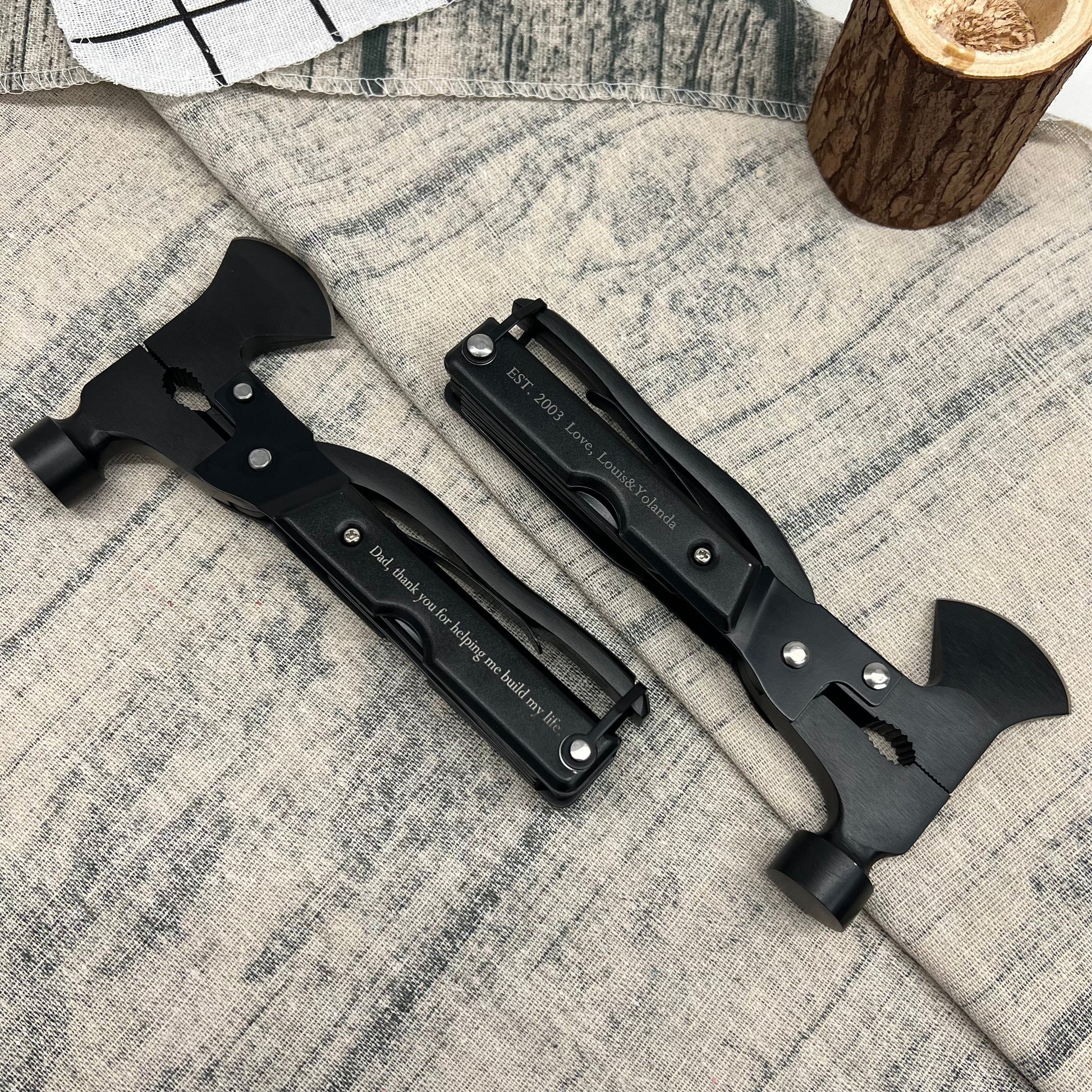 This is a 15-in-1 multi-functional hammer axe, made of high quality stainless steel, customized with exclusive blessings, name and year.