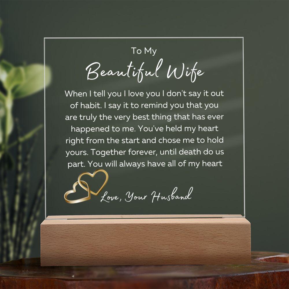 Say "I love you" in the most special and unique way with our "To My Beautiful Wife" Square Plaque. This stunning crystal-clear acrylic design comes with a sleek wooden base and is available with an optional LED wooden base for a truly memorable presentation. Perfect for special occasions like anniversaries. birthdays. or any occasion to show affection. Upgrade your message of love and appreciation with this beautiful plaque today.❤️