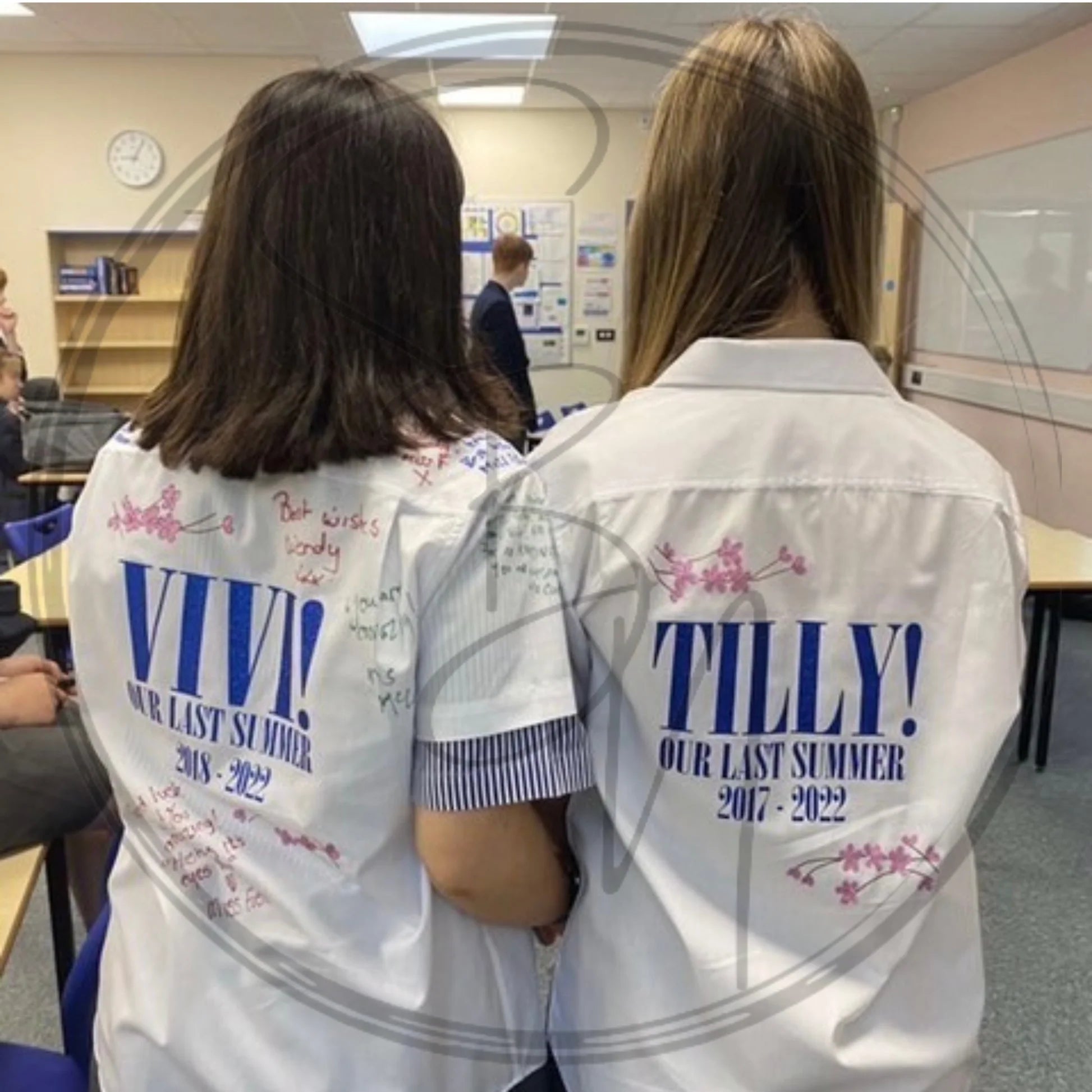 Leavers shirts. A perfect memory of your time in school, these handmade shirts are a perfect gift for students last day!