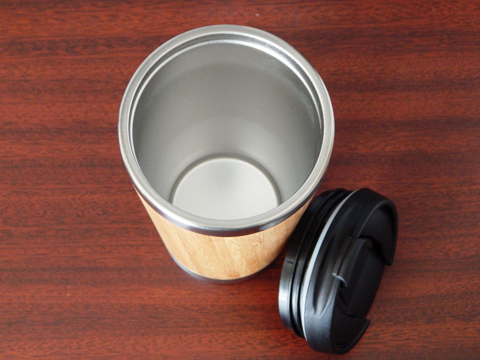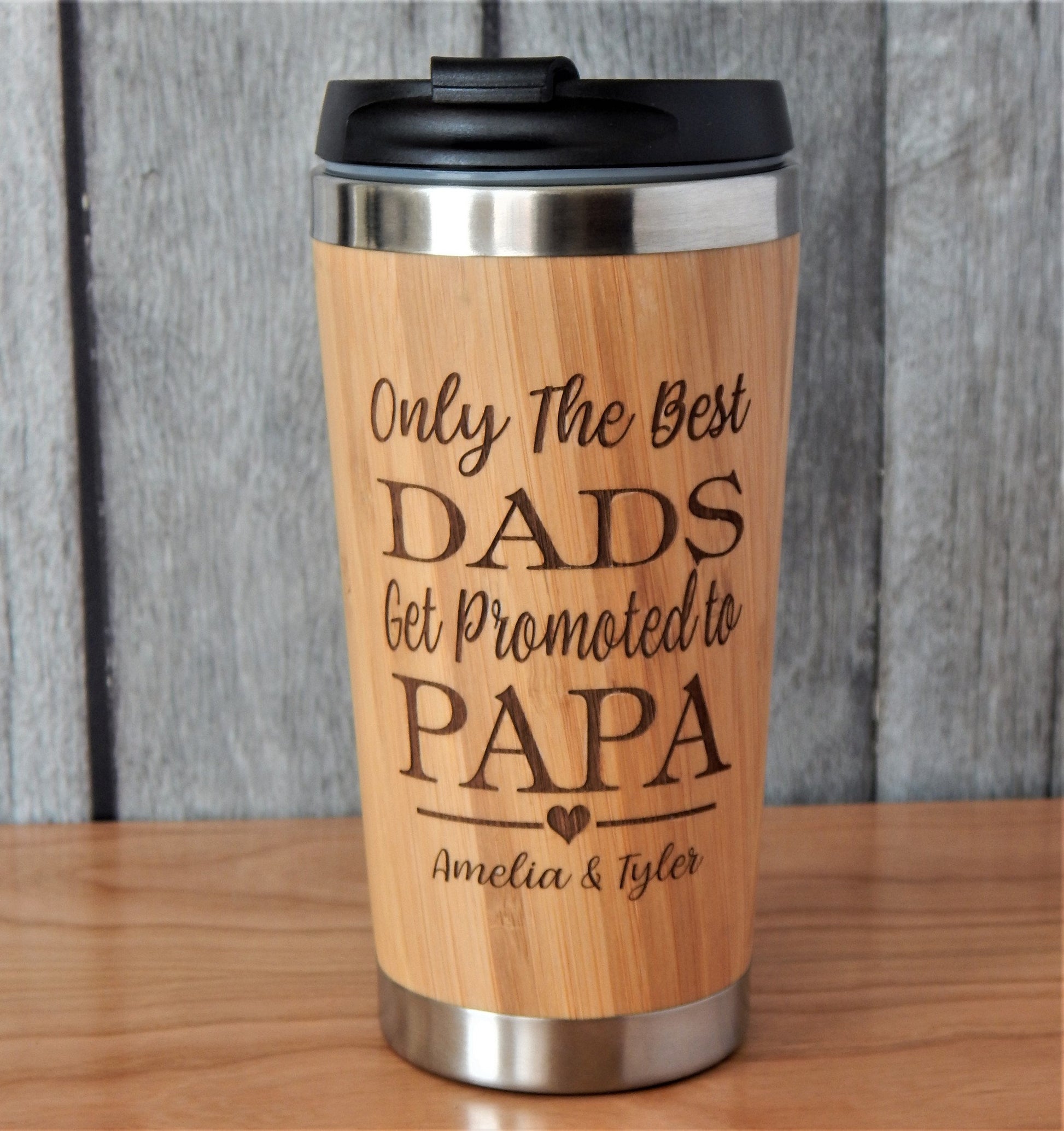 This unique engraved 15 oz travel mug is made from stainless steel and wrapped with bamboo fiber.